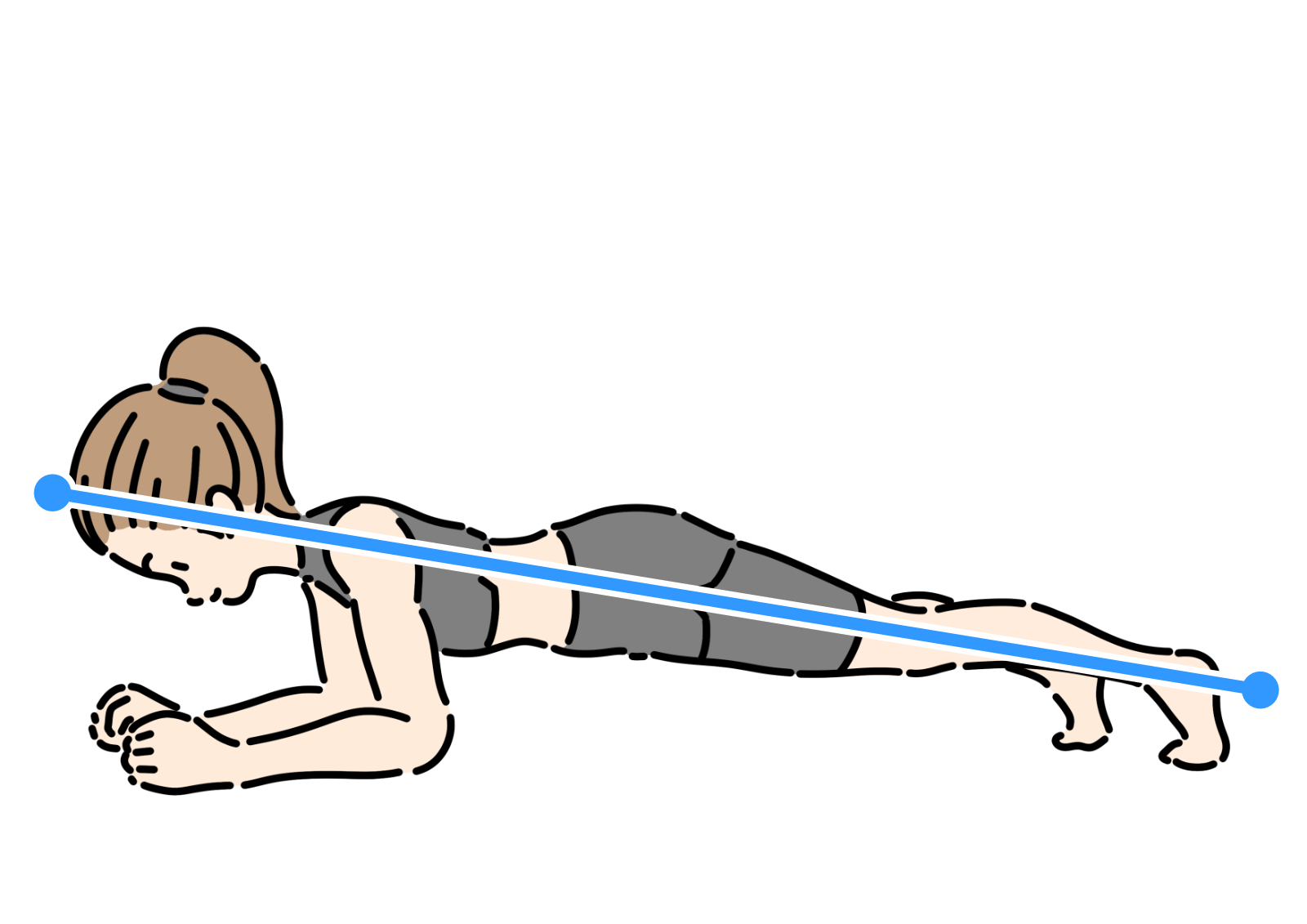 • 方法: 腕を肩幅に開いて床に置き、つま先を立てて体を一直線に保ちます。腹筋に力を入れながら、30秒~1分間キープします。